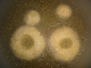 Se fac bilushtele in felul urmator: 2 bile mai mici pt capac si doua bile mai mari pt papanasii propriu-zisi. Cu un deget plin cu faina, se impunge bila mai mare direct in mijloc si se roteste pana obtinem o gaura maricica (hahaha).