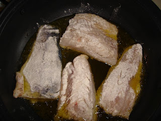Se freaca pestele cu sarea si piperul, se da prin faina si se prajeste in ulei de masline pe ambele parti pana cand devine auriu. Se scoate si se pune deoparte la scurs.
