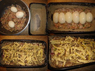 Tapetam o tava de chec cu unt+pesmet, apoi punem jumate din cantitatea de carne tocata. Taiem ouale in jumatati pe lung, jumatati pe care le asezam una langa alta, pe mijlocul checului, apoi punem al doilea strat de carne tocata. Presaram casul ras si ierburile pe deasupra, dam la cuptor, la foc mic (ca sa se intrpatrunda aromele) cca 45 de min – 1 ora.