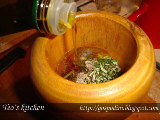 Am amestecat intr-un mojar o jumatate de canita de ulei de masline, 2 fire de rozmarin proaspat, 2 linguri de condimente pentru pui, o lingurita de sare, o lingurita de piper, 2 linguri de ierburi de Provance.