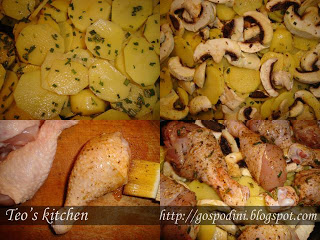 Am pus pulpele in tava peste cartofi si ciuperci si am dat la cuptor cca 45 de minute.