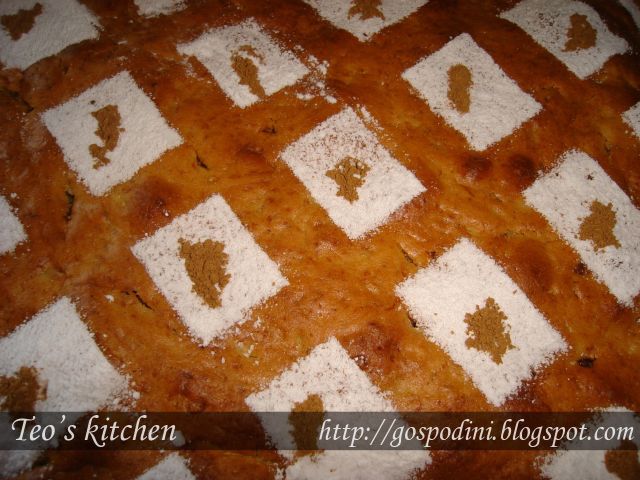 Tocmai ce am scos-o din cuptor; am taiat-o asa, fierbinte,ca eram taare curioasa!Eu nu am pus scortisoara,ci vreo 2 linguri de mac, iar dovlecelul l-am lasat necuratat. Este foaarte buna, dar as mai pune stafide….