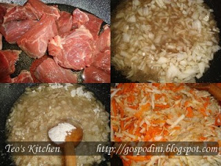 Spalam bine carnea si o curatam de pielite, apoi o prajim pe toate partile in ulei incins, pana se rumeneste. Luam carnea din tigaie si o tinem la cald. In uleiul in care am prajit carnea, calim ceapa pana se sticleste apoi adaugam faina, morcovii si telina date prin razatoare. Dupa ce legumele se inmoaie, se pune bulionul, se stinge cu o cana mare de apa calda si se lasa 15 minute sa fiarba innabusit.