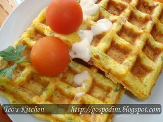 Mi-am dorit ca primele waffe sa fie sarate si am cautat printre toate retetele culinare pe care le aveam puse deoparte si am ramas la waffele propuse de S_tana (Mihaela) pe culinar, le-am modificat pe ici pe colo si au iesit niste delicioare waffe cu cascaval si salam.