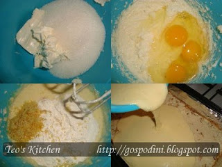 Cat aluatul sta la copt, pregatim crema: batem branza (care trebuie sa fie tot moale) cu zaharul tos, pana cand zaharul se topeste si obtinem o spuma de branza. E randul celor 3 oua, pe care le punem in compozitia de branza intregi. Dupa ca ouale sunt bine incorporate, punem coaja de lamaie, sucul de lamaie, esenta de lamaie si faina. Crema obtinuta se toarna peste blatul copt si se niveleaza cu o spatula. Prajitura se mai coace 30 de minute, pana cand face o crusta frumoasa. Testati-o cu scobitoarea inainte de a o scoate din cuptor.