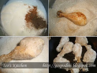 Am vazut o reteta culinara asemanatoare, de piept de pui crocant cu cocos, in Good Food dar si la Rachel Ray acum ceva vreme. Eu am adaptat reteta dupa ce am avut prin camara si rezultatul a fost surprinzator: pulpele de pui au facut o crusta aurie, uniforma si foarte crocanta, iar cocosul abia daca s-a simtit. O reteta foarte interesanta, de incercat chiar daca nu suntet fani ai combinatiilor dubioase.