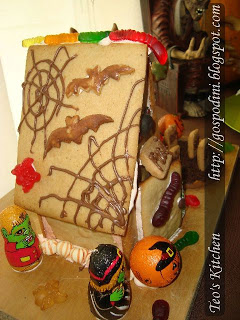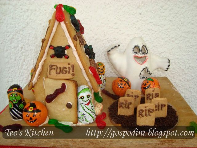 Asa ca, am facut o casuta de turta dulce pentru Halloween, de data asta bantuita, pazita de fantome, vrajitoare si monstrii, impanzita cu paienjeni, panza de paianjen si viermi de tot felul. Ce fel de casuta bantuita era daca nu avea si un mini cimitir, o fantoma care sa ne sperie teribil, un copac mai mult uscat decat viu si bineinteles o pancarda care ne anunta ca nu suntem deloc bineveniti?