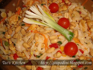 Amestecam taieteii, puiul, morcovii, ardeiul gras si ceapa. Separat, pregatim dressingul, amestecand sosul chilli, uleiul de masline, otetul, sucul de lamaie, sosul de soia si ghimbirul. Turnam sosul peste salata, amestecam bine bine si dam la rece. Inainte de servire, se presara cu arahide.