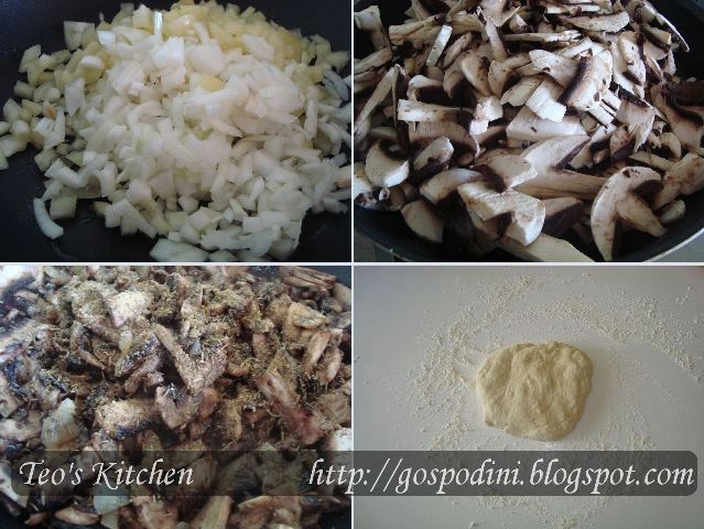 Intr-o tigaie mare, am incins uleiul si am calit in el ceapa si ardeiul. Nu le tinem mult, trebuie sa fie doar putin moi. Peste adaugam ciupercile taiate felii. Nu va faceti griji daca abia intra in tigaie, ciupercile se inmoaie foarte rapid. Condimentam dupa gust cu sare, piper si ierburile aromatice uscate si lasam pe foc pana ciupercile sunt moi. Impartim apoi aluatul in 4 parti egale. Lucram pe blatul tapetat cu faina.