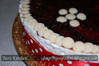 Am dat totul la frigider pentru 3-4 ore. Apoi am pus 1 plic de gelatina la inmuiat in 2 linguri de apa, am topit-o si am amestecat-o cu 400gr de dulceata de coacaze. Am turnat jeleul obtinut peste cheesecake si l-am intins intr-un strat uniform folosind o spatula. Pentru decoratiuni am folosit banuti de ciocolata alba si o panglica asortata, pe care am infasurat-o in jurul tortului.