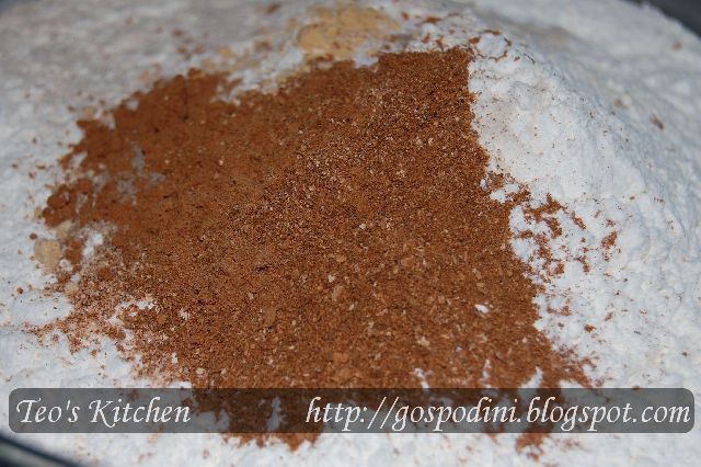 Separat, intr-un bol mare, amestecam faina, praful de copt si condimentele macinate.