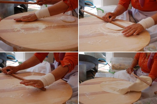 Intr-un vas mare cernem faina impreuna cu sarea, apoi adugam incet incet apa, amestecand bine. Cand aluatul incepe sa se lege si devine ferm, e momentul sa ne mutam pe planseta sau pe masa tapetata cu faina, unda continuam sa il framantam mult si bine, pana avem un aluat omogen si foarte elastic. Impartim aluatul in 6-8 parti egale, din care facem bile, pe care le punem inapoi in bol, acoperite cu un servet curat, pana pregatim umplutura. Gözleme e o placinta din aluat nedospit, pe care il intindem apoi foarte foarte subtire, ii punem umpluturi diverse, care pot varia de la branza cu marar (de la cascaval la feta si pana la branza traditionala turceasca) la carne toacata sau carne de miel, fructe de mare si pana la cartofi, ciperci sau legume coapte (vinete, spanac, dovlecei). Placinta se inchide apoi, la fel ca o pizza calzone, se unge cu un pic de ou, unt sau ulei de masline si se coace pe o plita – saç – bine incinsa. Ce e drept, iti trebuie o anumita indemanare sa intinzi placinta subtire de tot si in timp ce doamna ma invata sa fac, mi-am adus aminte de Buni Sia, care poate intinde aluatul pentru taietei de casa atat de subtire incat vezi prin el si nu i se rupe niciodata. Daca erau blogguri culinare pe vremea lui Buni, era cea mai de succes cu Anastasia’s Kitchen 🙂 Acuma sa va arat pozele ca sa intelegi cum exact se face Gözleme si de ce a fost o experienta atat de draguta pentru Teo bloggerita culinara.