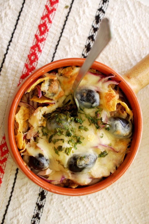 Am incins cuptorul la 200°C si intr-un vas termorezistent am asezat straturi de chipsuri, fasii de piept de pui, ceapa taiata pestisori,masline, ardei iuti, si deasupra am pus cascavalul razuit si coriandru tocat marunt. Am dat tava la cuptor 10 minute pana se topeste cascavalul.