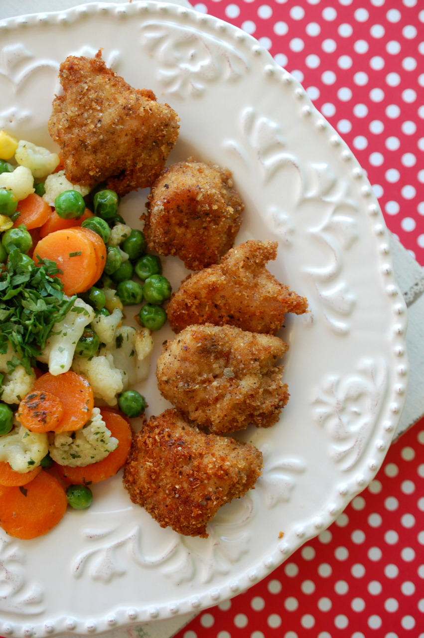 Acum ca v-am spus toate secretele mele legate de cei mai buni nuggets pe care i-a mancat Luca vreodata (asta dupa spusele lui si la cati nuggets a mancat el in lunga lui viata de 5 ani fara o luna… nu stiu cat de credibila e afirmatia, dar daca a zis… a zis! Clar?!?!? 🙂 ) va las cu pozele de final. Noi i-am asortat cu legume facute la steamer si apoi trase un pic la tigaie cu unt, nu de alta dar e suficient ca am prajit carnea in ulei, nu era musai sa mai suplimentam cu piure sau cartofi prajiti. Sa va fie de cel mai bine! 🙂