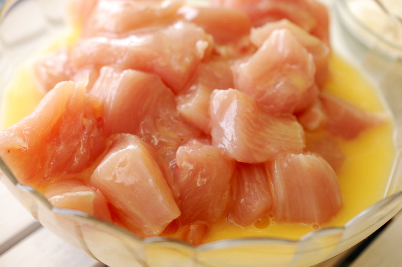 Am pus cubulete de piept de curcan intr-un bol mare si am turnat untul deasupra apoi l-am masat frumusel, sa ma asigur ca fiecare bucata e bine acoperita de unt.