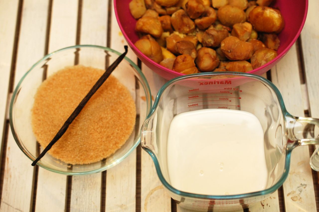 Punem apoi smantana dulce, miezul de la batonul de vanilie (dar si teaca pentru ca va aromatiza crema), zaharul si castanele intr-o craticioara incapatoare si le lasam la foc mix, 20 de minute, pana crema da cateva clocote, isi schimba culoarea, zaharul este topit complet si castanele sunt moi. Apoi nu ne ramane decat sa dam totul prin bleder.