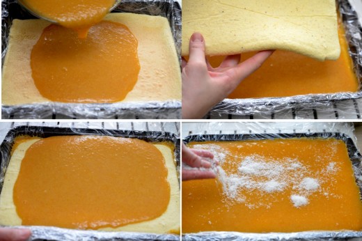 Acum ca avem si foile si jeleul pregatite, nu ne ramane decat sa asamblam prajitura. O sa vedeti ca fiind vorba de pandispan, foile se strang putin dupa ce se racesc, asa ca ati putea folosi o tava putin mai mica pentru asamblare, in care foile de prajitura sa intre perfect. Indiferent ca folositi o tava mai mica sau exact aceeasi tava in care ati copt foile, tava trebuie tapetata foarte bine cu folie alimentara de plastic. Punem o foaie, turnam jumatate din jeleu, punem a doua foaie, turnam al doilea strat de jeleu. Lasam sa se racoreasca o jumatate de ora, apoi garnisim prajitura cu fulgi de nuca de cocos, fulgi de migdale, nuci macinate, sau ce mai aveti la indemana si ar da bine in contrast cu jelul portocaliu.