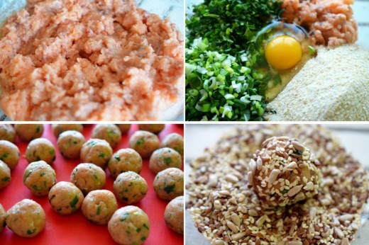 Mai intai si mai intai dam somonul prin bleder, cateva secunde sunt suficiente pentru a avea “carne tocata de somon”. Apoi amestecam toate ingredientele, mai putin semintele si le framantam bine. Atentie, sosul de soia este el insusi foarte sarat, deci mai incet cu pianul pe scari… ca sarea in chiftele, puneti pe gustate. Dupa ce am framantat si totul se leaga bine (daca e prea moale compozitia, mai punem pesmet, daca e prea tare mai punem un ou, ideea e sa nu fie chiar tare ca piatra iute ca sageata, pentru ca vor fi foarte tari chiftelele dupa coacere). Modelam apoi chiftelele, le trecem prin amestecul de seminte si le coacem: in cuptorul incins la 180 de grade, in tava tapetata cu hartie de copt, timp de 25-30 de minute, timp in care agitam tava de cateva ori ca sa fi siguri ca se coc uniform, sau le prajim in ulei, in mod normal, sau in Air Fryer, 15 minute, la 200 de grade si tot asa, le agitam de cateva ori in timpul prajirii.