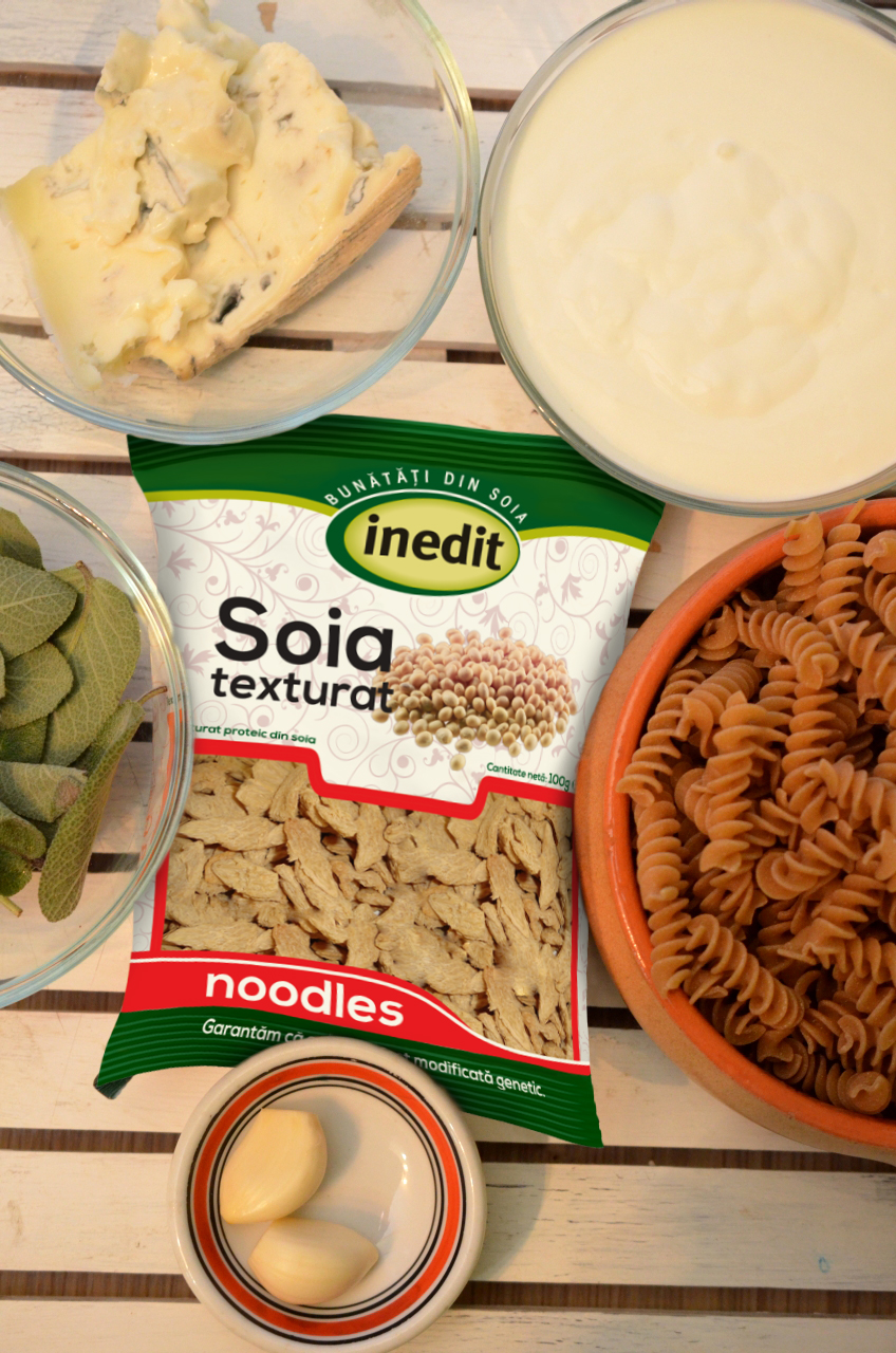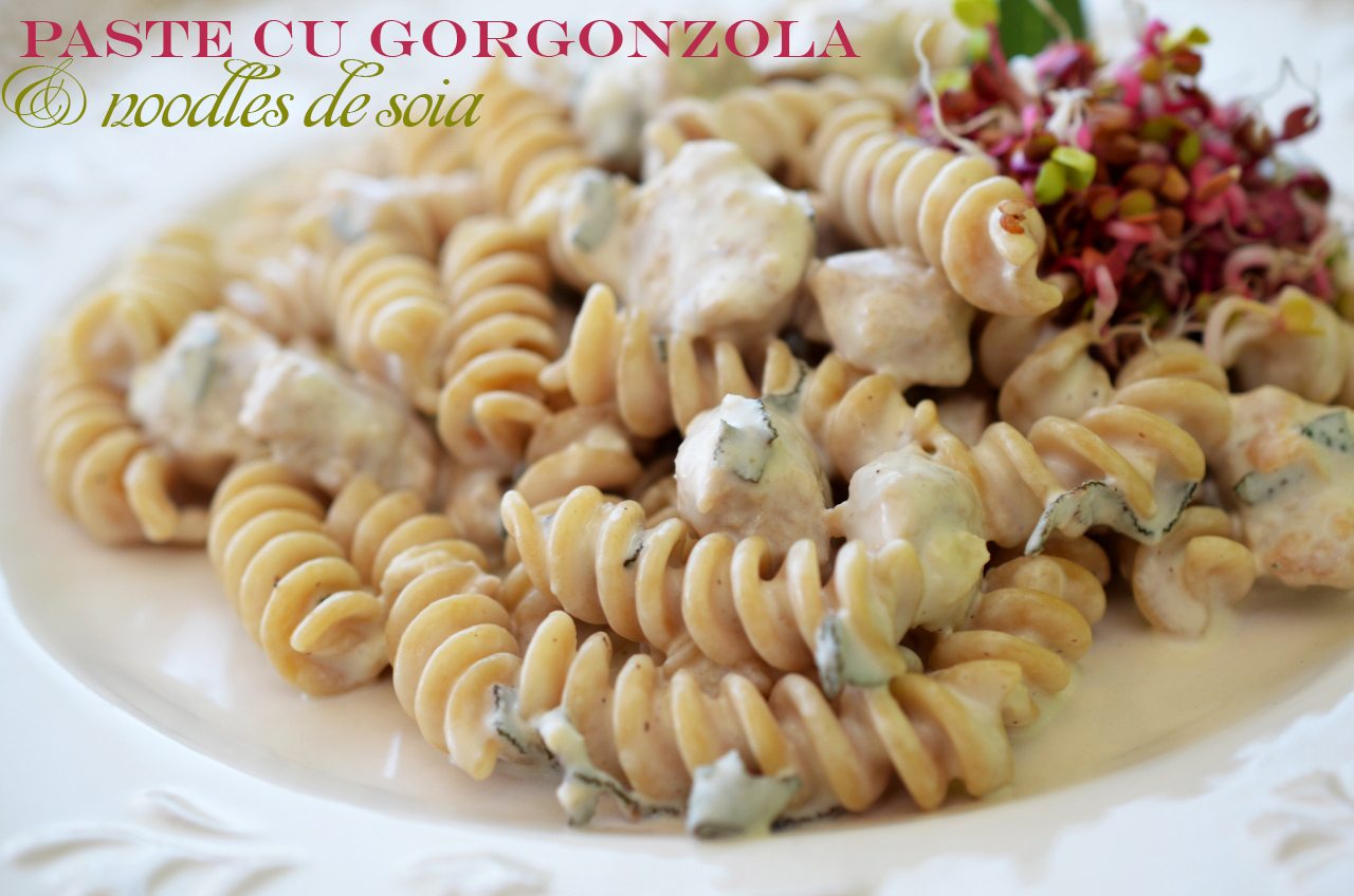 Puiul cu sos de gorgonzola este una dintre mancarurile mele preferate, asa ca am ingredientele intotdeauna in casa. Si daca tot le-am avut, m-am gandit sa incerc reteta de paste cu gorgonzola si noodles de soia. Au iesit foarte bune! Am folosit noodles de soia de la Inedit, preferatele mele. Secretul pentru noodles de soia, pentru ca tind sa ia mai multa apa decat granulele, fiind bucati mai mari, e ca dupa ce le fierbeti 15 minute in apa cu sare, trebuie sa le lasati bine bine la scurs intr-o sita, apoi sa le apasati foarte bine in hartie de bucatarie, pana nu mai este strop de apa. Ne-am inteles? Sa stiti ca mie imi place foarte mult soia in general si o incerc in tot felul de retete, nu doar cele de post si in tot felul de combinatii cu ingrediente de origine animala. Soia e buna pentru ca e sanatoasa, completeaza o dieta echilibrata si sper sa va imprieteniti cu ea cat mai repede 🙂