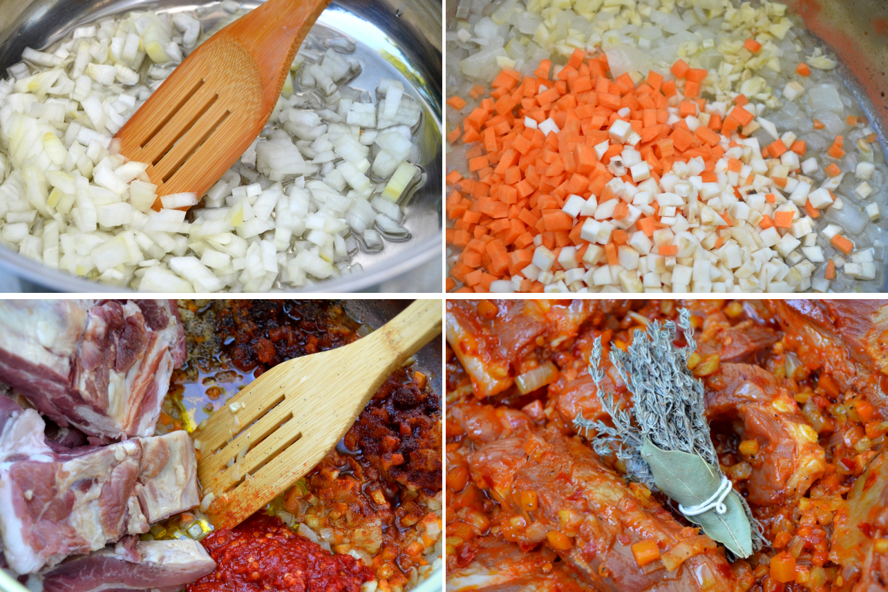 Mai intai ne ocupam de fasolea boabe, pe care o lasam la inmuiat in apa peste noapte, apoi o scurgem si o punem la fiert in apa cu sare. Cand apa da cateva clocote, scurgem fasolea, o trecem pe sub jet de apa rece si o punem din nou la fiert, in apa noua. Repetam procesul de 2-3 ori, pana fasolea e fiarta pe jumatate, ca sa fim siguri ca nu ne face probleme digestive. Pana fierbe fasolea, ne ocupam de legume – ceapa o taiem marunt, morcovii, telina si pastarnacul le taiem cubulete mici. Intr-o oala mare incingem uleiul si calim ceapa cu putina sare, pana devine sticloasa. Adaugam si morcovii, pastarnacul, telina si usturoiul taiat marunt sau trecut prin presa de usturoi. Le calim impreuna, amestecand des, pana legumele incep sa se inmoaie (5-6 minute la foc mediu). Adaugam scarita (pe care puteti sa o lasati intr-o singura bucata daca incape in oala sau sa o taiati in bucati mai mici), pasta de ardei, sare, piper, boia. Amestecam bine, adaugam foile de dafin si cimbrul.
