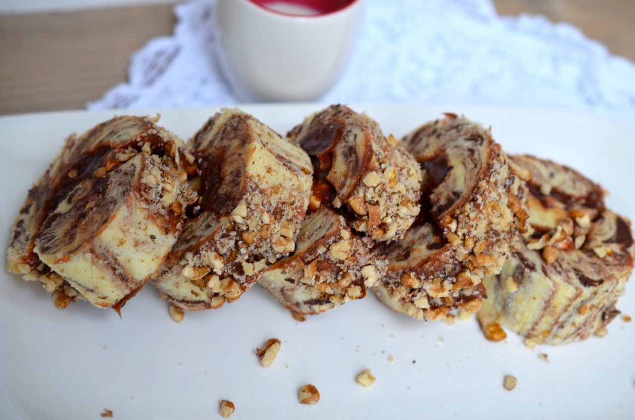 Ne pregatim incet incet cu retete de prajituri pentru Craciun? Daca da, atunci sa stiti ca asta e rulada cu ciocolata perfecta pentru a-l astepta pe Mosul, langa un pahar de lapte rece. Blatul se face foarte simplu, este acelasi blat folosit pentru rulada de la “Sarlota cu fructe”, reteta pe care o gasiti AICI. Doar ca de data asta, nu am mai umplut rulada cu gem, ci am facut un ganache de ciocolata, unul mai special, pentru ca am folosit ciocolata cu lapte si alune de padure intregi si nu orice fel de ciocolata, ci una Lindt, foarte foarte fina. Da, stiu, si mie mi-a fost putin mila sa folosesc asa o ciocolata pentru un ganache, dar credeti-ma, face o foarte mare diferenta si rezultatul nu se compara cu ganach-ul pe baza de ciocolata de menaj, fie ea chiar si cu lapte. Ce am mai schimbat la reteta? Am pastrat 3-4 linguri din aluat, in care am pus 2 lingurite de cacao si putin rom, apoi, dupa ce am intins blatul in tava, am pus din loc in loc compozitia de cacao si am folosit o frigaruie pentru a marmora blatul. Asa a iesit rulada pe care o veddeti in poza, arata spectaculos si a impresionat pe toata lumea, desi am muncit la ea…vreo 20 de minute 🙂