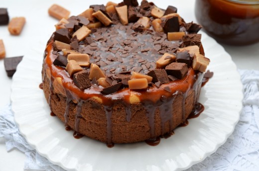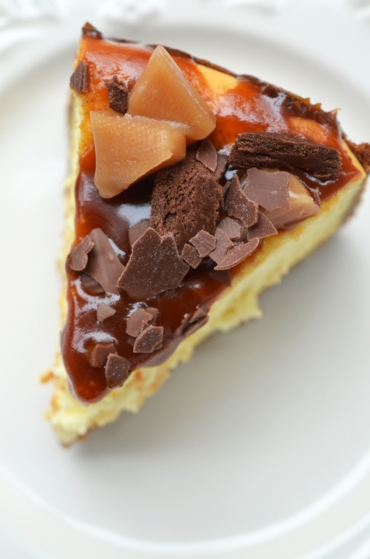 Lasam prajitura sa se raceasca la temperatura camerei, circa o ora, apoi turnam desupra siropul caramel si il intindem cu spatula astfel incat sa curga frumos peste marginile cheesecake-ului. Si apoi, decoram frumos frumusel cu fulgi de ciocolata si caramel taiate grosier.