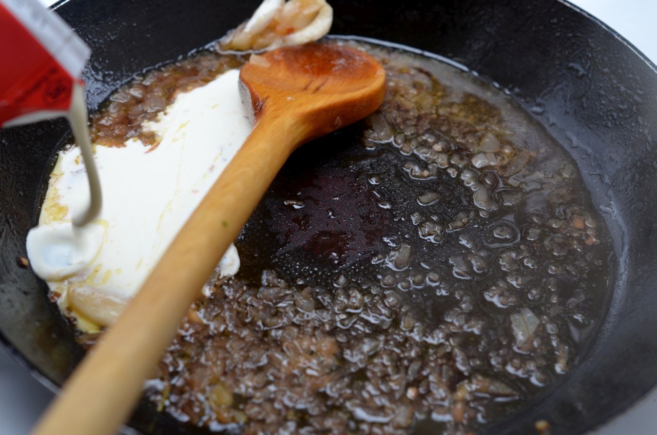 Pentru sos, incingem intr-o tigaie o lingura de ulei de masline si calim ceapa si usturoiul, pana devin translucide. Stingem cu vinul rose si il lasam sa scada, cca 2 minute la foc mic. Adaugam apoi smantana, amestecam bine, asezonam cu sare si piper. Punem si sofranul , amestecam si mai punem sos pe foc 2-3 minute la foc mic, pana cand incepe sa se ingroase. Strecuram apoi sosul si, daca mai e nevoie, punem sare si piper 🙂
