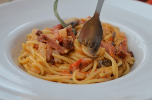 Reteta scurta de vineri: cea mai simpla reteta de paste! Chiar este cea mai simpla reteta, ideala pentru gospodine incepatoare, mamici grabite, proaspat casatoriti, studenti, burlaci š Ce poate fi mai simplu decat sa punem TOATE ingredientele intr-o oala, inclusiv pastele si sa le fierbem toate impreuna? Amidonul din paste ne ajuta sa avem un sos cremos, legumele si pancetta le dau pastele toata aroma de care au nevoie si parmesanul doar leaga totul si mai bine impreuna! š