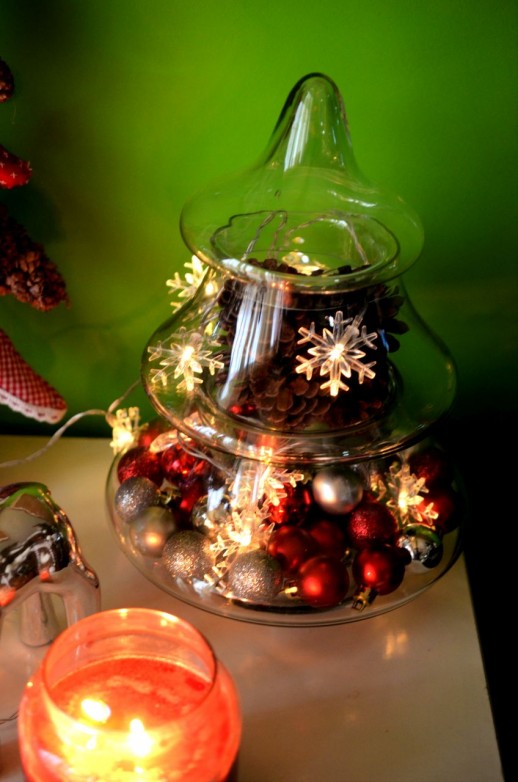 Borcanele/recipentele de sticla – Apothecary Jars – dar si vaza – le-am cumparat de la Arian Glass Deco, este o insula in Polus si preturile sunt mai mult decat accesibile, fiind preturi de producator. Am umplut bolurile cu globuri, instalatii luminoase cu led, pe baterii si diverse combinatii de conuri de brad. Instalatiile luminoase cu baterii, pe care mi le-am droit de foarte mult timp si tot nu am gasit in Romania, le-am luat de la Lidl si de la Nobila Casa. Sunt perfecte nu doar pentru Craciun, ci si in general pentru a decora casa, foisorul pe timpul verii, camera copilului in loc de lampa de veghe, tablia patului pentru o atmosfera calda si romantica 🙂