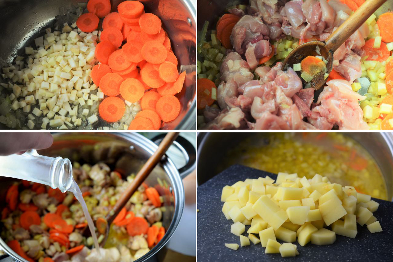 In oala in care fierbem ciorba (o oala de 5 litri) punem uleiul si calim ceapa, pana devine translucida. Adaugam apoi radacinoasele taiate cubulete si morcovii, le calim impreuna cu ceapa 2-3 minute sau pana incep sa se inmoaie. Adaugam si carnea de pui, taiata cubulete. Prajim si carnea pana isi schimba culoarea, condimentam cu sare si piper si turnam borsul si apa. Lasam dupa a fiarba cca 10 minute din momentul in care incepe sa fiarba. Punem si cartofii, taiati cubulete mici. Cartofii fierb mai repede decat radacinoasele, de aceea nu ii punem de la inceput. Cand carnea, cartofii si legumele sunt fierte, potrivim ciorba de sare si piper, daca mai e nevoie punem si bors. Lasam ciorba sa se racoreasca putin, deci tragem oala de pe foc.