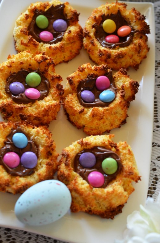 Incingem cuptorul la 160°C si tapetam tava cu hartie de copt. Amestecam cu mixerul la viteza mare crema de lapte condensat, albusul si vanilia pana sunt omogene. Adaugam miezul de nuca de cocos si amestecam bine, pana avem o compozitie care sta bine legata cand o strangem intre degete. Cu o lingura de inghetata sau cu mainile usor umede modelam bilute din compozitie, de cca 3-4 cm diametru. Le asezam in tava si le apasam in mijloc cu degetul mare, astfel incat sa ia forma de cuiburi. Coacem cuiburile 17-20 minute sau pana sunt usor rumenite pe margini. Le scoatem din cuptor si cat sunt calde, le apasam inca putin cu degetul, pentru a definitiva forma de cuib. Le lasam sa se raceasca de tot inainte de a le umple cu Nutella si drajeuri.