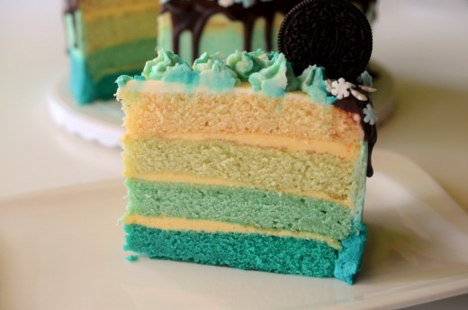 La final trebuie sa avem o compozitie care are consistenta inghetatei. Din aceasta compozitie vor iesi 2 blaturi. Pentru ca blaturile sa fie uniforme, cantarim compozitia si o impartim in 2 parti egale, in doua boluri diferite. Mie mi-au iesit exact 900g compozitie asa ca am impartit-o in doua boluri a 450g fiecare. Repetam reteta astfel incat sa avem 4 boluri cu compozitie pentru blat de tort: unul il lasam natural, fara a adauga colorant alimentar, apoi adaugam in cele 3 ramase cate o picatura in fiecare bol, astfel incat sa avem 3 nuante diferite de albastru (sau ce culoare doriti), care sa mearga de la deschis spre mai inchis. Nu uitati, intotdeauna puteti adauga colorant daca este nevoie, dar nu puteti scoate din el o data incorporat, asa ca e de prefarat sa mergeti din aproape in aproape pana ajungeti la nuantele dorite. Coacem blaturile pe rand, in cuptorul incins la 180°C, 20-25 minute sau pana trece testul scobitorii. Lasam apoi toate blaturile sa se raceasca de tot inainte de a continua reteta.