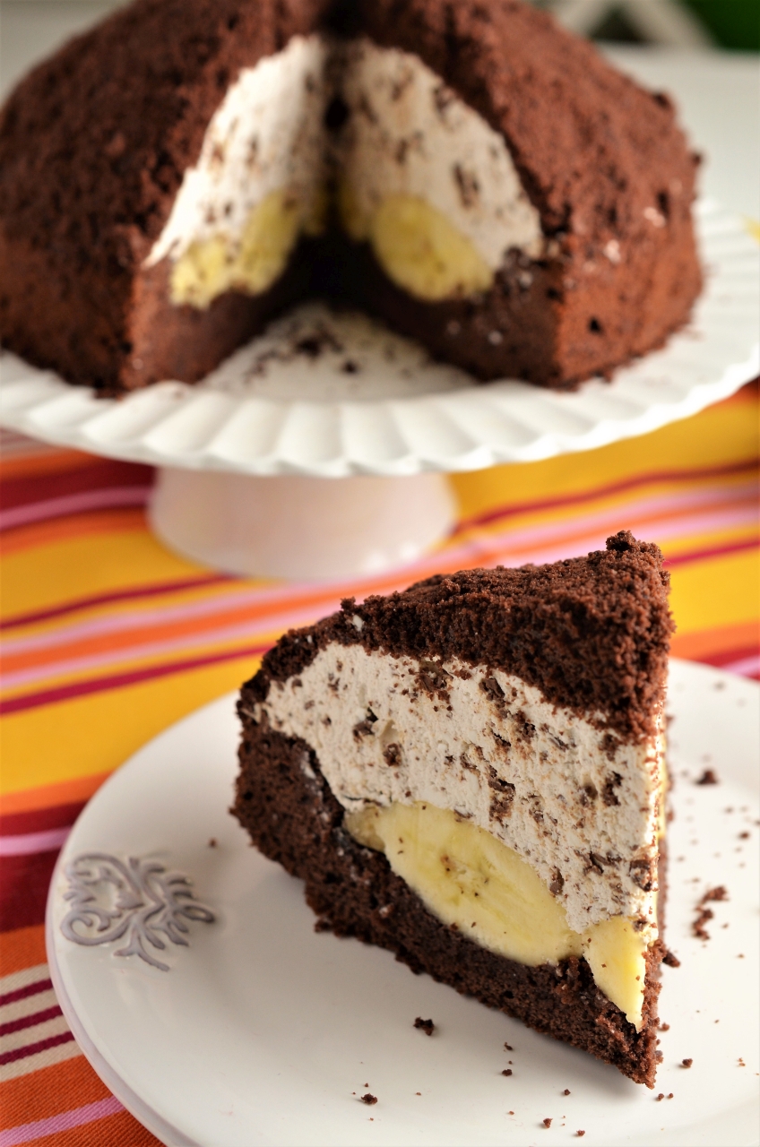 Turnam compozitia in tava si coacem 30-35 minute sau pana trece testul scobitorii. Lasam apoi blatul sa se raceasca foarte bine, ii taiem capacul si ii scobim miezul cu grija, astfel incat sa ramana 2 cm de margine si fund. Tinem deoparte toate fimiturile, pe care le vom folosi la decor. Insiropam foarte bine blatul cu siropul de zahar ars. Asezam in mijloc bananele, fie intregi, fie taiate pe jumatate. Peste banane urmeaza un strat de crema.