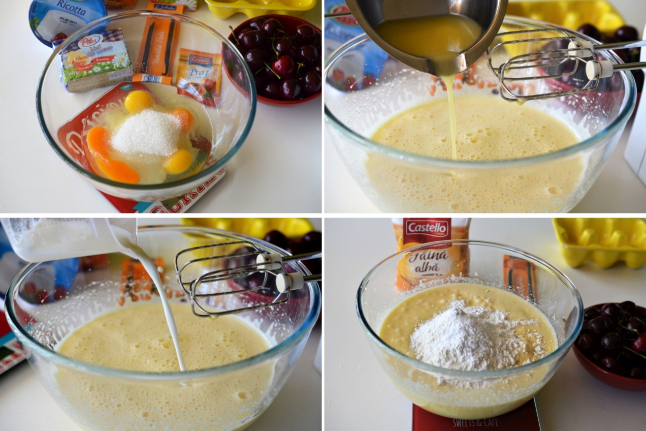 Batem spuma ouale si zaharul, pana isi dulbeaza volumul si devin albicioase. Adaugam pe rand untul topit si racit, laptele, miezul pastaii de vanilie. Amestecam cu mixerul. Punem si ricotta bine scursa, amestecam. La final punem faina cernuta impreuna cu praful de copt. Nu amestecam in exaces, ci numai cat sa incorporam ingredientele.