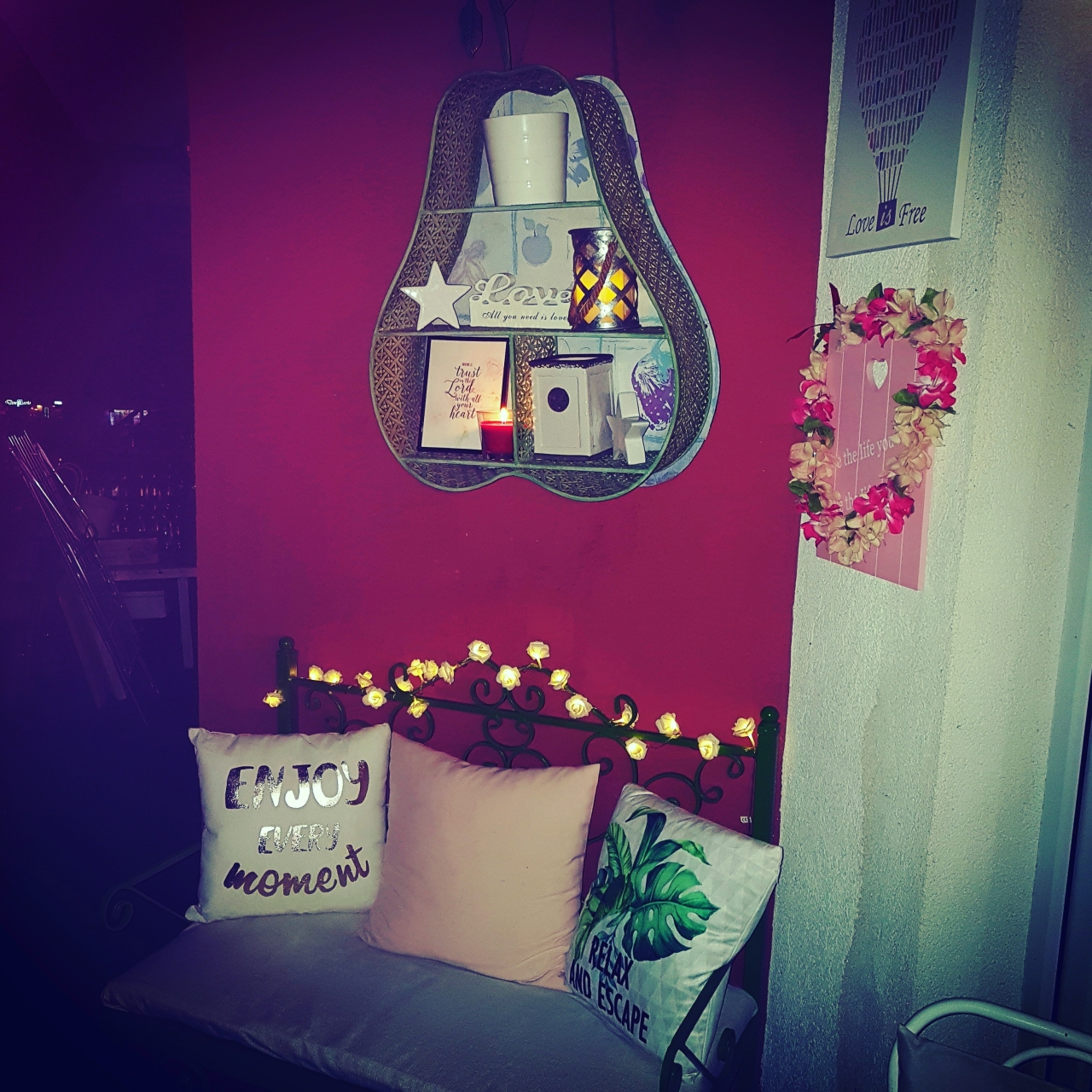 Nu pretind ca am un balcon wow si nici ca e pe gustul tutoror, dar cu siguranta este pe gustul meu! Mi-am dorit sa imi crez exact ce scrie pe pernuta decorativa: o oaza de liniste si relaxare, un colt numai al meu, unde sa pot “fugi” cand am 5 minute libere. Iar seara? Cand aprind toate lumanarile si ghilanda luminoasa? Este cel mai simpatic moment al zilei 🙂