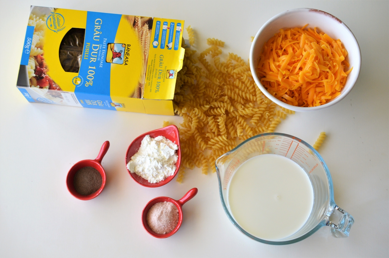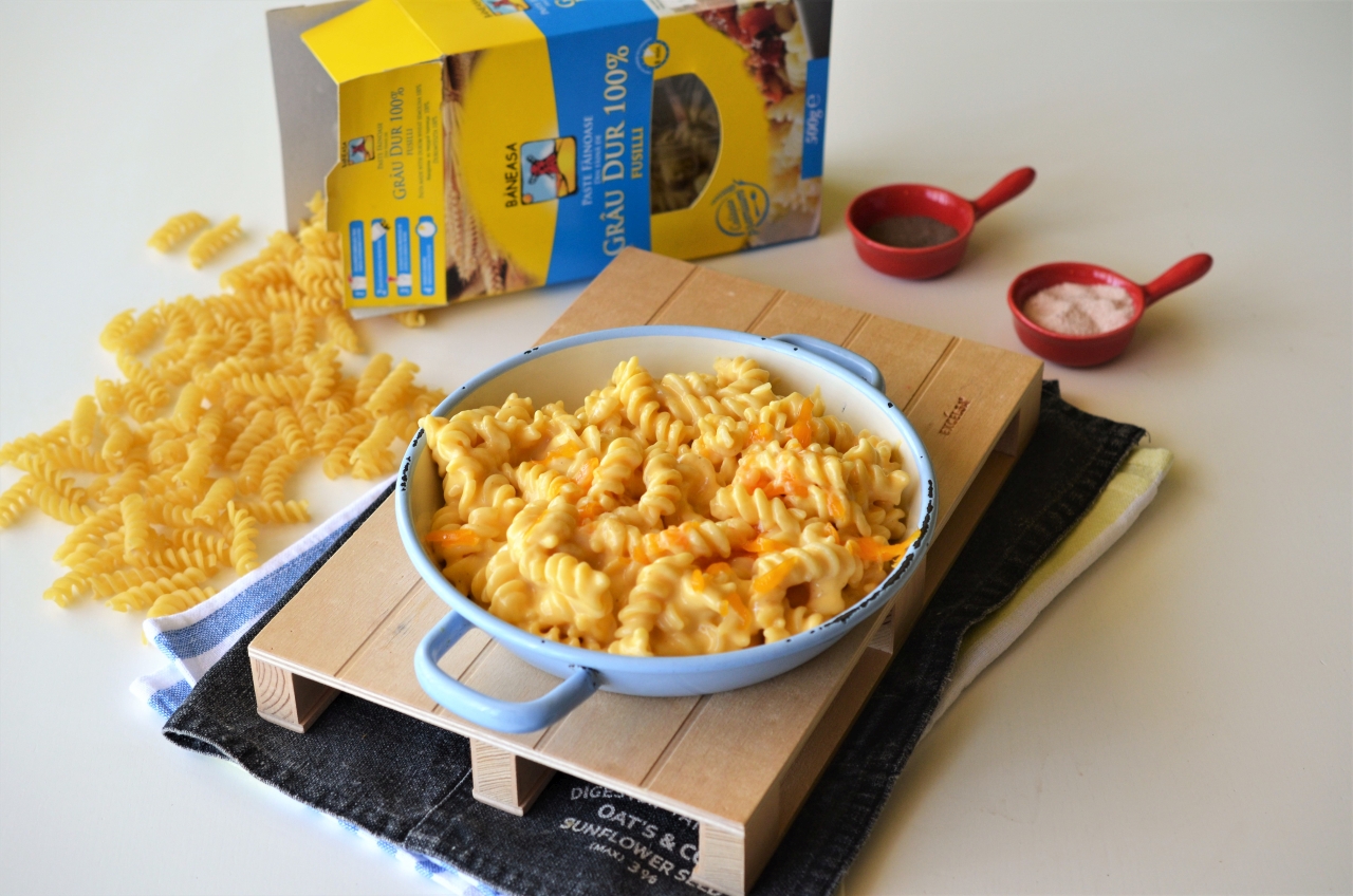 La capitolul paste, am ales sa folosesc pentru reteta de Mac and cheese fusilli din grau dur de la Paste Baneasa, pentru ca forma lor este perfecta in astfel de retete cu sos cremos: fusilli retin sosul si branza Cheddar “intra” in toaaaaate spiralele!