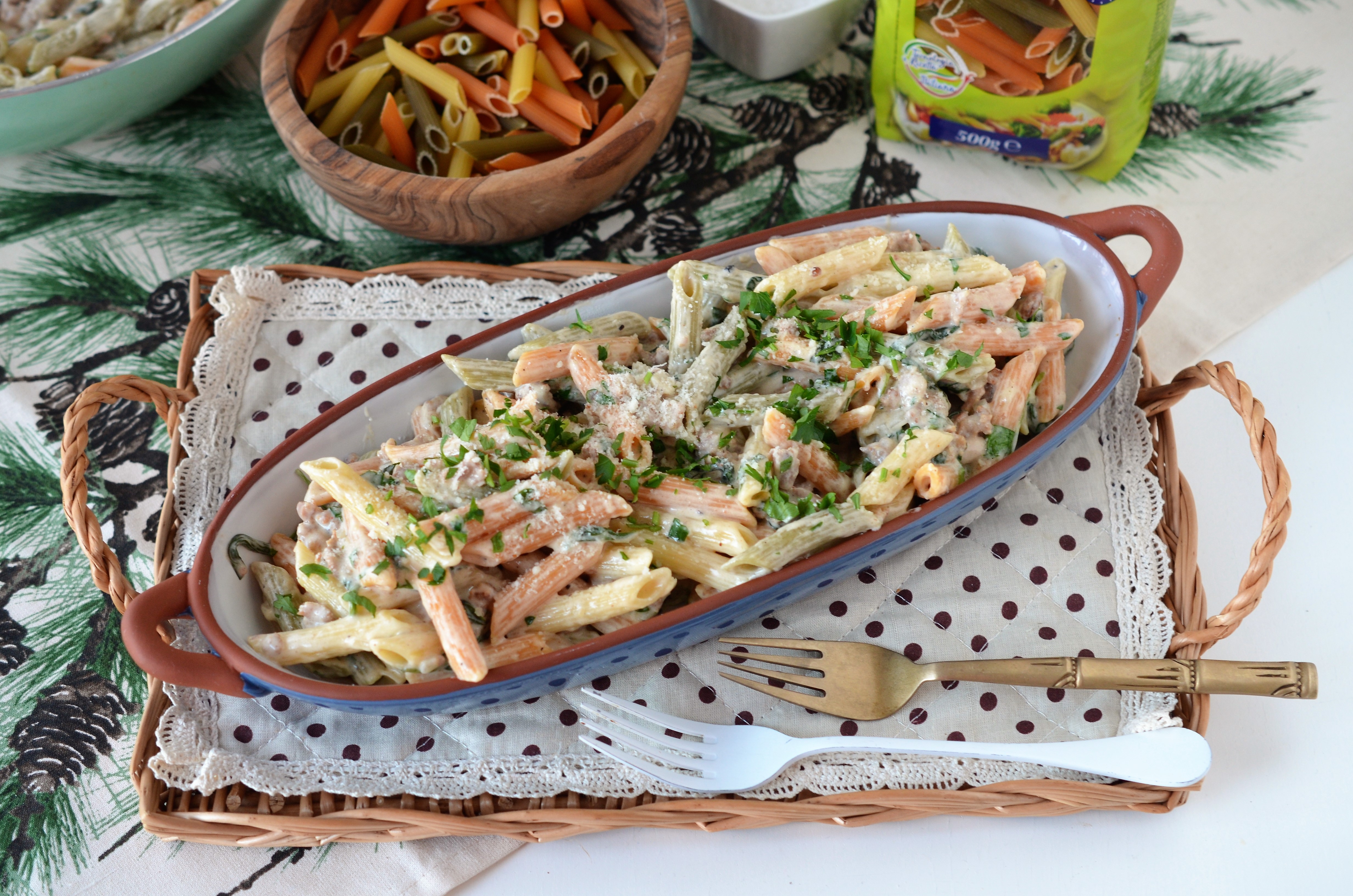 Ce paste folosim pentru reteta de Paste cu carnati si sos alb? Ca de obicei, alegerea mea in materie de paste ramane Paste Baneasa. Pentru reteta de azi am ales Penne rigate tricolore, din 100% grau dur. De ce va recomand pastele din grau dur de la Baneasa?