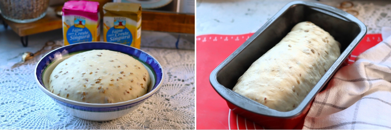 - Când aluatul și-a dublat volumul, îl modelăm sub formă de franzelă și îl punem într-o tavă de chec unsă bine cu spray non-stick sau unt și făină.